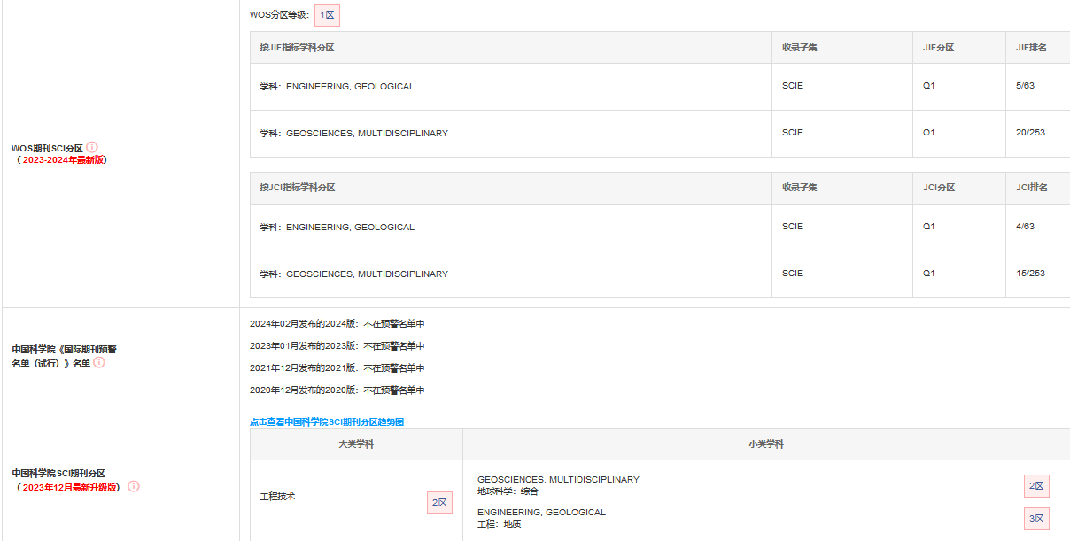 Landslides在JCR分區(qū)為地球科學(xué)綜合1區(qū)。在2022年中科院分區(qū)中,大類為地球科學(xué)2區(qū),小類為地球科學(xué)綜合2區(qū)和工程地質(zhì)3區(qū)。