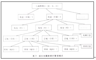 農 村地籍管理采用:縣(市、區)—鄉(鎮)—行政村—圖斑模式組織數據,數據的組織單元為行政村(見圖2 )。