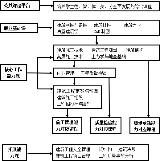 通過直接面對企業的調查問卷,確定了企業對畢業生就業崗位需求狀況,按需求比例依次是施工員、質檢員、造價員、測量員、材料員、安全員、資料員、試驗員。由于我院工程造價專業主要培養造價員,所以建筑工程技術專業主要培養除造價員以外需求比例前三的施工員、質檢員、測量員。本次調研以鋼筋混凝土高層結構為例,確定了施工員、質檢員、測量員職業崗位為核心的典型事件任務,分析歸納了施工員、質檢員、測量員的行動領域,進而初步確定學習領域,根據課程的前后關系,確定建筑工程技術專業課程體系示意圖如圖1所示。