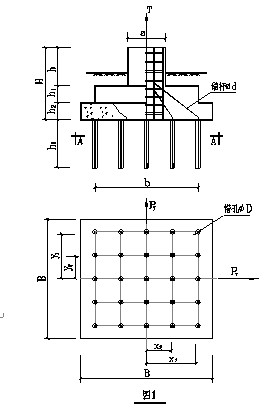 分析工程地質特點,1米左右可塑粘土,1米以下為完整微風化灰巖。粘土地區通常選用板式或臺階基礎,遇到完整硬質巖石開挖困難時則多選用錨筋基礎。根據工程特點,采用了淺埋臺階基礎加巖石錨桿結合的特殊基礎形式。通過臺階基礎底板和巖石錨桿分別將基礎下壓力和上拔力傳到基巖上。采用巖石錨桿淺埋臺階基礎有效結合了兩種基礎形式及工程地質條件的優點。