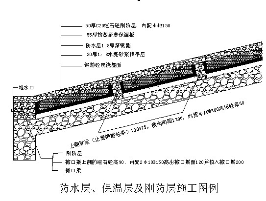3.5.5 鋪55厚擠塑聚苯保溫板,后澆50厚C20細(xì)石砼屋面剛防層(即薄型屋面板,內(nèi)配φ4 @150并與檐口梁、山墻梁插筋綁扎牢固),檐口梁、山墻梁加高部位砼順斜屋面坡度一次性澆注成型。