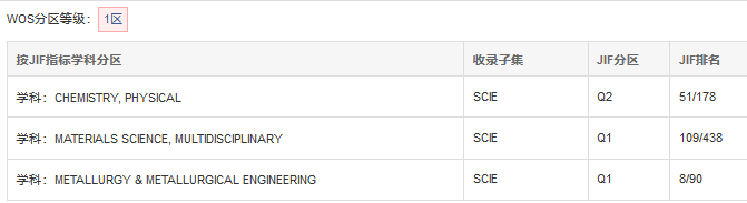 在中科院分區中,該期刊位于2區頂級期刊。而在JCR分區中,它位于材料科學的Q1區。