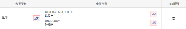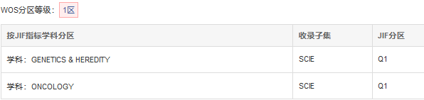 JCR分區(qū)在JCR遺傳學(xué)與遺傳類別中排名25位,屬于Q1分區(qū);在JCR腫瘤學(xué)類別中排名62位,屬于Q2分區(qū)。