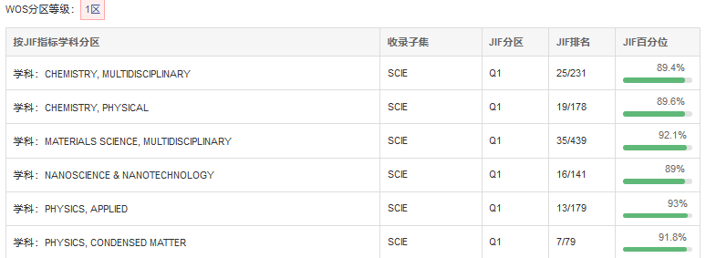 2023-2024年WOS分區中,在化學綜合、物理化學、材料科學綜合、納米科技、應用物理、凝聚態物理等多個學科領域均處于Q1區。