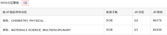 在 JCR 分區(qū)中,“MATERIALS SCIENCE, MULTIDISCIPLINARY”(材料科學(xué),多學(xué)科)領(lǐng)域位列 Q1(85/439),“CHEMISTRY, PHYSICAL”(物理化學(xué))領(lǐng)域位于 Q2(46/178);按 JCI 指標(biāo)學(xué)科分區(qū),“CHEMISTRY, PHYSICAL” 和 “MATERIALS SCIENCE, MULTIDISCIPLINARY” 均為 Q1 區(qū)。