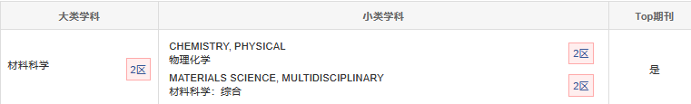 中科院分區(qū)(2023 年 12 月升級(jí)版)中,屬于材料科學(xué)大類 2 區(qū) Top 期刊,小類學(xué)科物理化學(xué)為 2 區(qū)、材料科學(xué)綜合為 2 區(qū)。
