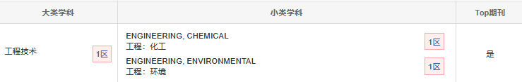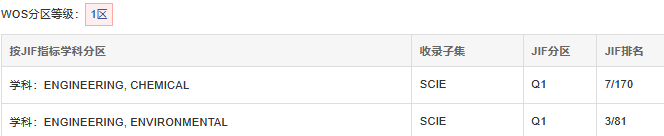 JCR分區:在工程技術大類下的“化學工程”“工程:環境”等學科均位列Q1區。