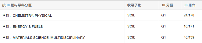 JCR分區: 材料科學綜合(Q1)、能源與燃料(Q1)、物理化學(Q1)。