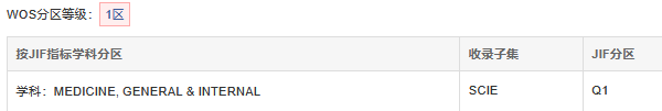 WOS分區:2023 2024年最新版中,WOS分區等級為1區。按JIF指標學科分區,在“MEDICINE, GENERAL & INTERNAL”學科中處于Q1區,JIF排名57/329,JIF百分位82.8%;按JCI指標學科分區,同樣在“MEDICINE, GENERAL & INTERNAL”學科中處于Q1區,JCI排名69/333,JCI百分位79.43% ,在WOS分區體系中表現較好。
