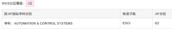 WOS分區:2023 - 2024年最新版中,WOS分區等級為2區。按JIF指標學科分區,在“AUTOMATION & CONTROL SYSTEMS”學科中處于Q2區,JIF排名32/84,JIF百分位62.5%,在WOS分區體系中處于中等位置。